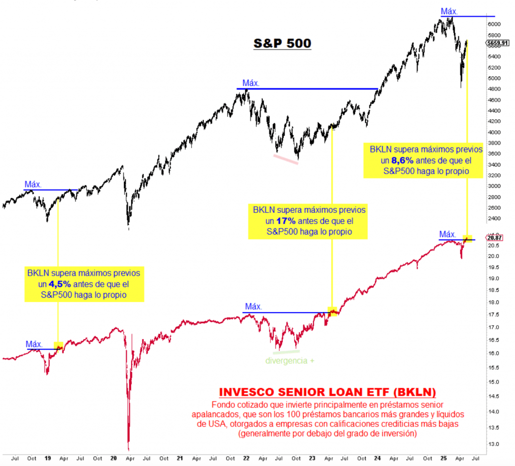 En el gráfico inferior mostramos una comparación entre el S&P500 y el fondo que invierte en los 100 principales préstamos senior apalancados americanos, otorgados a empresas por debajo de grado de inversión. La correlación de este fondo con el S&P 500 es evidente. Podemos comprobar cómo este índice ya ha superado los máximos del mes de abril, mientras que el S&P500 está a un 8,6% de hacer lo propio. Este dato evidencia cómo el apetito del inversor por el riesgo se encuentra mejor que a finales del mes de febrero.
