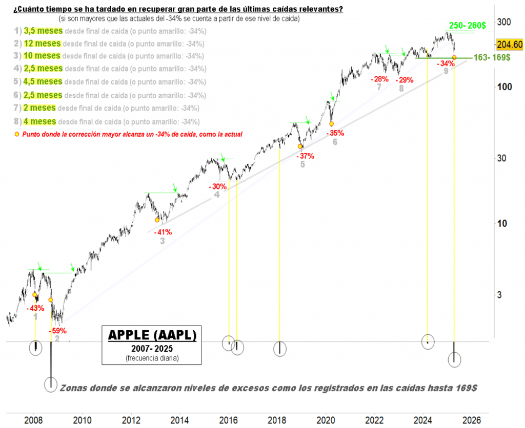 Renta 4 | Estudiamos desde el año 2007 las grandes caídas de APPLE y su tiempo de recuperación desde los mínimos, o en su defecto, si fueron mayores que la actual (-34% desde los máximos del pasado diciembre), desde el punto donde acumulaba un -34% de caída. En los últimos 18 años, en menos de 12 meses se había recuperado la mayor parte de la caída. La zona de 250-260 dólares se alza como su principal resistencia de cara a los próximos meses. La zona de soporte clave se localiza en los mínimos de este mes, entre 163 y 169 dólares.
