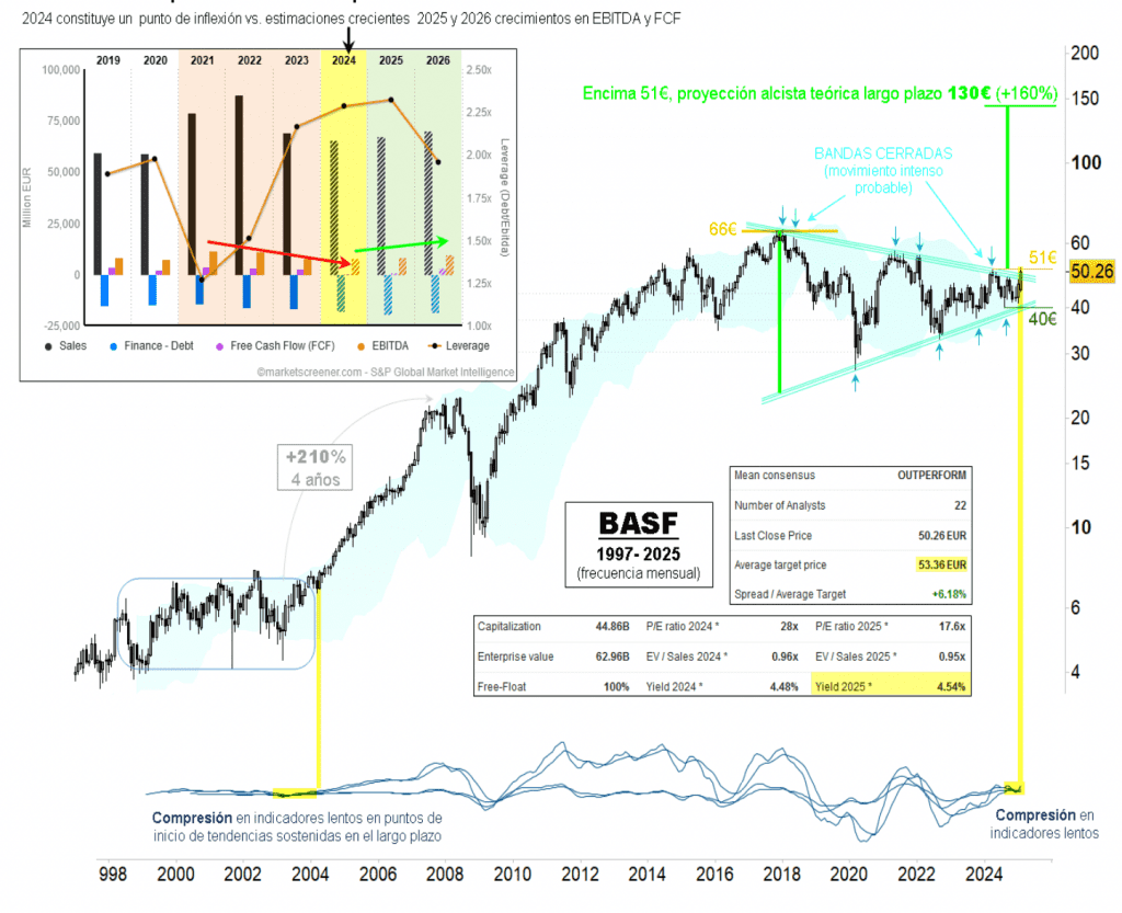 Renta 4 | La química alemana comienza a romper la tendencia bajista desde los máximos del año 2018, situándose en máximos de los últimos tres años. El acotamiento de su fluctuación desde aquel año ha provocado una compresión anómala en sus indicadores y bandas, situación que frecuentemente precede el inicio de movimientos más intensos en el medio/largo plazo. La proyección alcista teórica, en caso de confirmarse esta ruptura de la zona de 51 euros, apunta hacia niveles de 130 euros (+160%) para el medio/largo plazo. El cambio de tendencia en el precio coincide con un cambio de tendencia de los crecimientos estimados de cara a 2025-2026. La zona de soporte clave a respetar se sitúa en 40 euros.