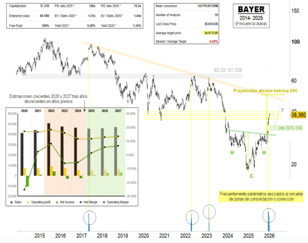 La presencia de una zona de resistencia en los niveles actuales podría favorecer una toma de beneficios previa, en su caso, a ulteriores subidas. El hueco alcista abierto entre 30,5 y 33 euros se presenta como el soporte inmediato de mayor relevancia.