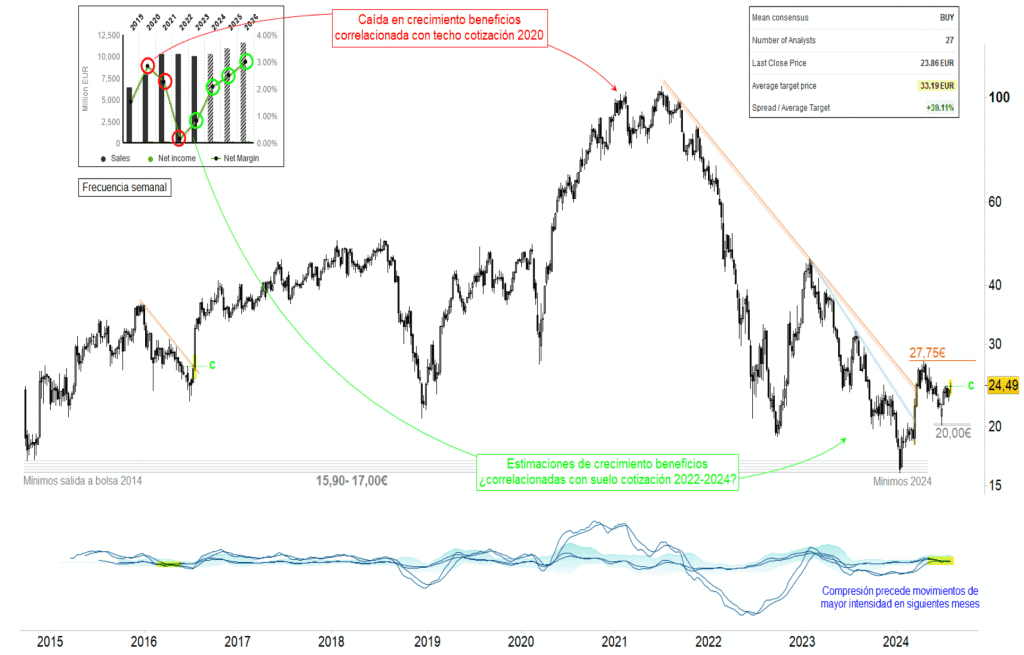 El precio presenta en 27,75 euros, máximos del pasado mayo, su principal resistencia más inmediata. Las estimaciones del consenso de analistas son crecientes en muchas de sus principales magnitudes de cara a 2025 y 2026, presentando precios objetivo casi un 40% por encima de los niveles actuales.
