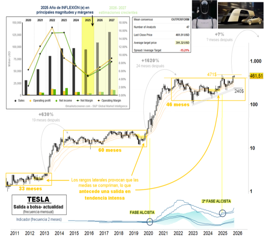 Concluiremos el informe analizando la acción desde un punto de vista técnico. Se aprecia cómo en septiembre el valor ha conseguido por primera vez, en cierre mensual, alzarse por encima del rango de los últimos 46 meses. Se aprecia también cómo, desde su salida a bolsa, es la tercera vez en que TESLA consolida su marcha alcista en el interior de sendos rangos laterales, comprimiendo sus indicadores y saliendo con fuerza al alza meses después. A nuestro juicio, los detalles técnicos son muy positivos a medio/largo plazo, esperando una tendencia intensa al alza en el medio plazo. Las estimaciones de los analistas apuntan también a una inflexión al alza en sus principales cifras y márgenes hacia 2026 y 2027, apoyando esta tesis alcista. La zona de soporte más importante se localizaría en niveles de 240 dólares.