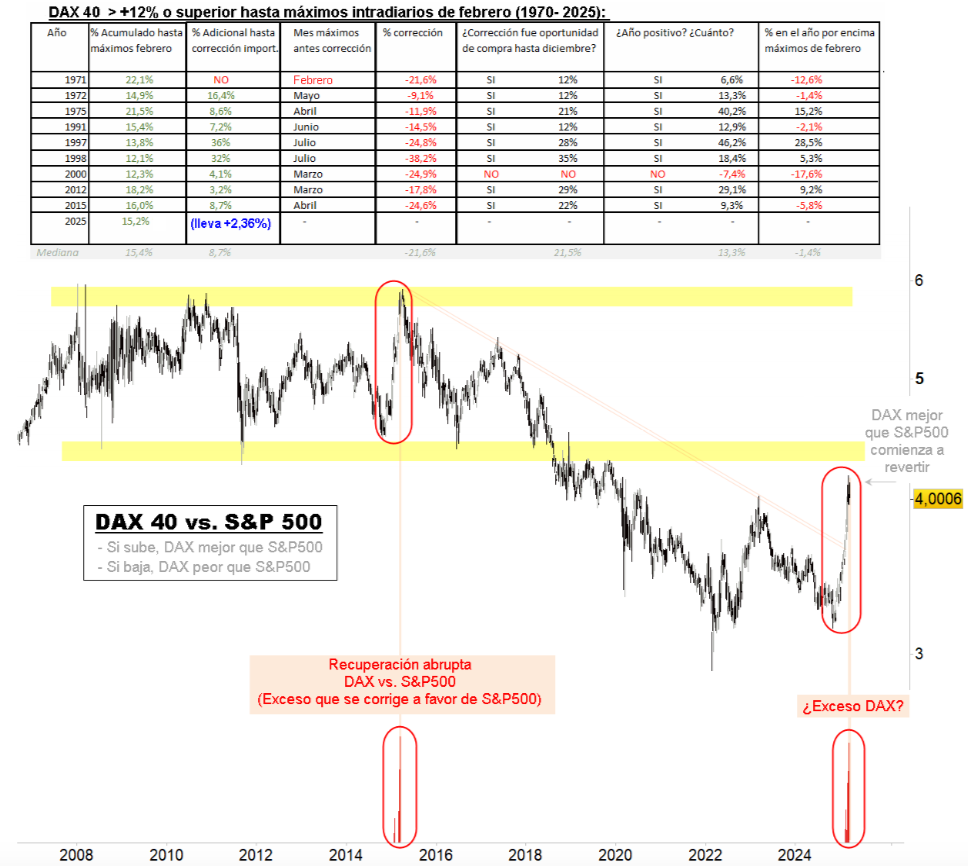 Renta 4 | Mostramos el relativo entre el índice alemán, el DAX 40 y el americano, S&P 500. Como podemos ver, desde el pasado noviembre el alemán acumula un mejor comportamiento respecto al americano. La exponencial recuperación muestra síntomas excesivos, teniendo en cuenta los últimos 18 años. En base al estudio que hicimos sobre el DAX y su rentabilidad acumulada entre enero y febrero, creemos probable que dicho diferencial pueda menguar a favor del S&P 500 durante los próximos meses.