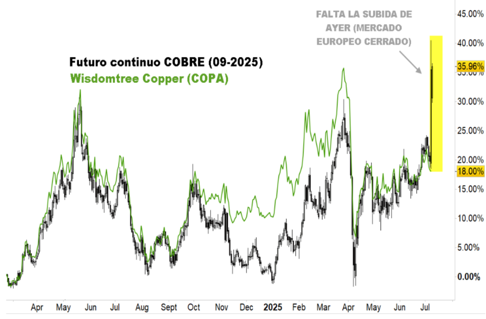Renta 4 | El precio del cobre subía ayer por la tarde noche tras el anuncio de Donald Trump de un arancel de un 50% a las importaciones. El anuncio disparó el precio del cobre por encima de los máximos de los últimos 18 años, en niveles de 5,48 dólares por libra, ahondando la tendencia alcista que el metal ya presentaba en los meses anteriores, como podemos comprobar en el gráfico inferior. El dato, sin duda, refuerza el momentum de medio/largo plazo de esta materia prima.