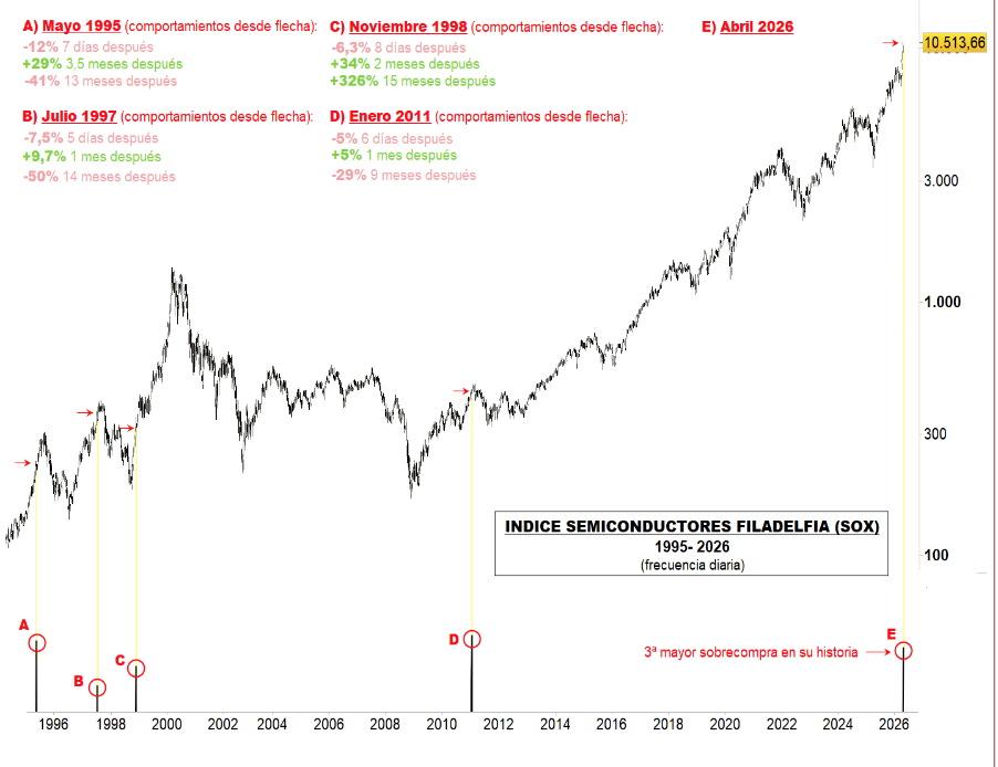 Esta euforia deja actualmente en el índice de semiconductores la tercera sobrecompra más elevada en su historia. Si atendemos a las cuatro ocasiones anteriores en las que se produjeron lecturas de sobrecompra similares se aprecia una pauta común. En las cuatro veces, una corrección de cierta importancia se produjo en el índice al cabo de 5-8 sesiones después, aunque después de esta corrección, en las cuatro ocasiones, una subida tuvo lugar, marcando nuevos máximos entre 1 y 3 meses después.