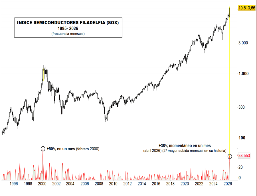 NVIDIA y revalorizaciones superiores al 100% en INTEL desde los mínimos del pasado 30 de marzo. El índice de semiconductores de Filadelfia (SOX) acumula en el mes un 38% de revalorización, siendo la segunda subida mensual más alta en sus 32 años de historia.