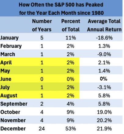 Un dato a favor de lo anterior es que, en los últimos 45 años, cuando el S&P500 ha marcado un máximo en el mes de abril, solo en un 1 de esos 45 años ha sido su máximo del año. Nótese que, en base a los datos, la probabilidad de que el S&P500 marque un máximo anual desde abril hasta agosto, e incluso hasta septiembre, es más baja (8-12%).