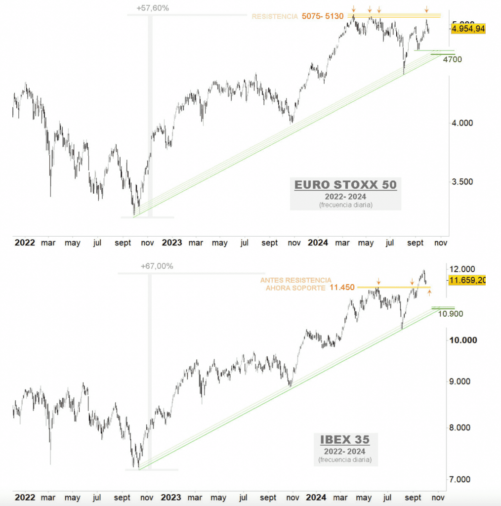 Renta 4 | Semana correctiva en las plazas europeas, con el Eurostoxx 50 cediendo desde zonas próximas a los máximos del pasado mes de marzo, engrosando un nivel clave de resistencia a batir entre 5075-5130 puntos. El punto de soporte clave se localiza en 4700 puntos. El Ibex 35, por su parte, sitúa en esos máximos del mes de marzo, en 11450 puntos, su soporte inmediato, tras haberlo superado hace pocas semanas.