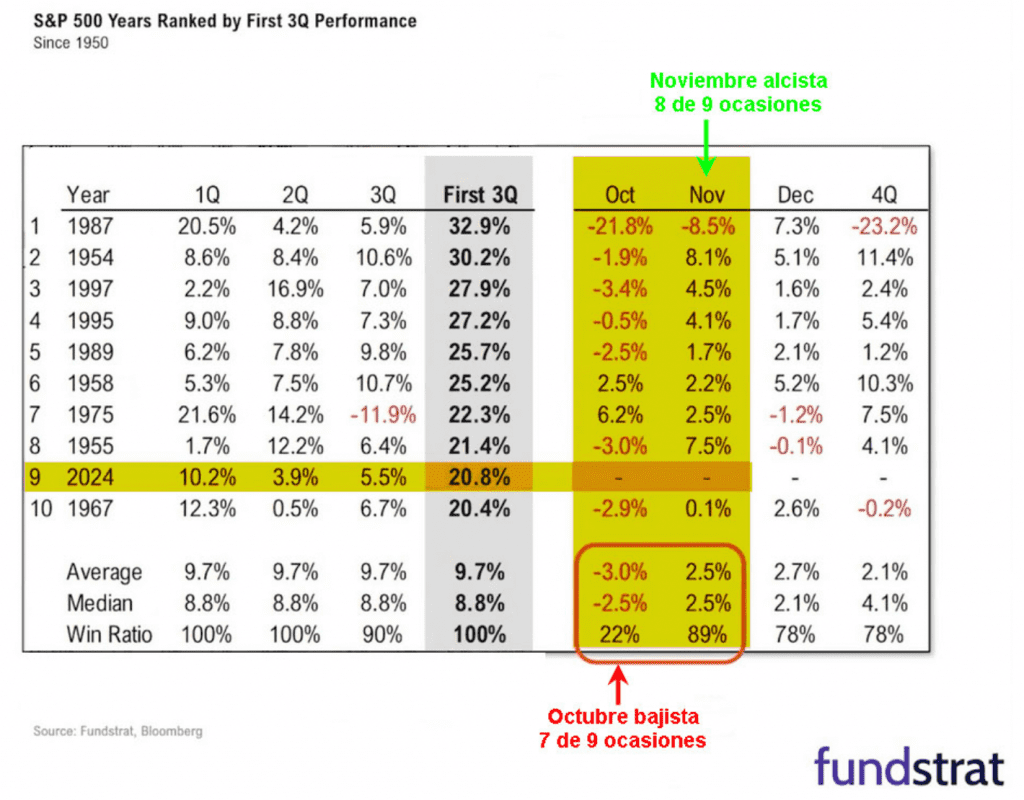 En la tabla inferior, elaborada por Tom Lee de Fundstrat, muestra el desempeño histórico del S&P500 cuando los primeros tres trimestres presentan subidas superiores al 20%. De este modo, pese a que septiembre ha tendido a ser negativo en la mayor parte de las veces, noviembre, ha tendido a ser muy positivo, cerrándose el cuarto trimestre con ganancias en el índice: