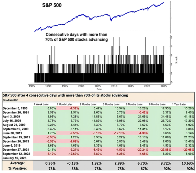 Pese a que la primera parte del año pueda presentar más turbulencias en el S&P500, muchos datos siguen intuyendo un desempeño positivo en 2025. En el estudio inferior de @subutrade mostramos las reacciones del índice cuando presenta cuatro días consecutivos con más del 70% de sus miembros subiendo. Como puede verse, en el 92% de los últimos 35 años, el comportamiento del índice es positivo 9 y 12 meses después. En base a este se podría esperar la probabilidad de que en septiembre y diciembre el S&P500 se sitúe por encima del cierre del 16 de enero (5.940 puntos):