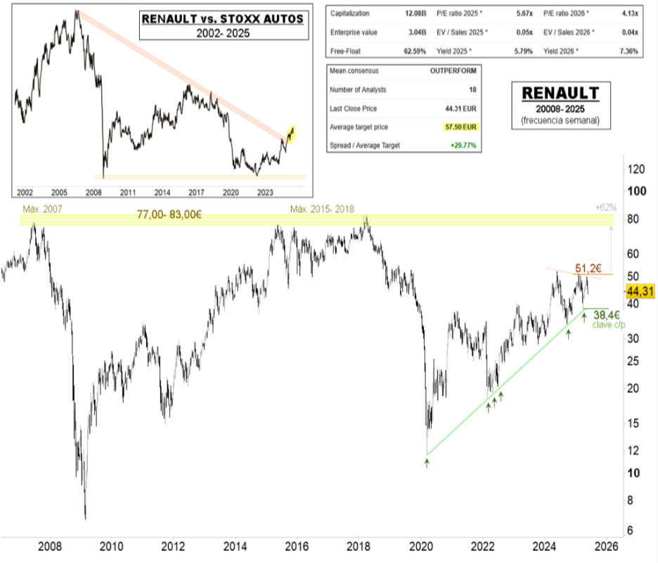 Renta 4 | Impecable tendencia alcista desde los mínimos de 2020, formando una perfecta directriz alcista desde entonces, que potencia a su paso, en 38,4 euros, los mínimos del pasado 7 de abril como punto clave de soporte para un inversor de medio plazo. El valor mantiene un mejor comportamiento relativo respecto a su sector, presentando resistencia clave en 51,2 euros, nivel que abriría el camino hacia los máximos de 2007, 2015 y 2018, entre 77 y 83 euros.