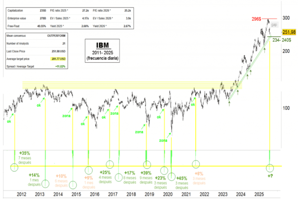 Estos datos se potencian con la cercanía del paso de la directriz alcista desde los mínimos de 2023, que marca una zona importante de soporte entre 234 y 240 dólares. El gap bajista abierto en 282 dólares y los máximos históricos comentados en 296 dólares se presentan como resistencias inmediatas.