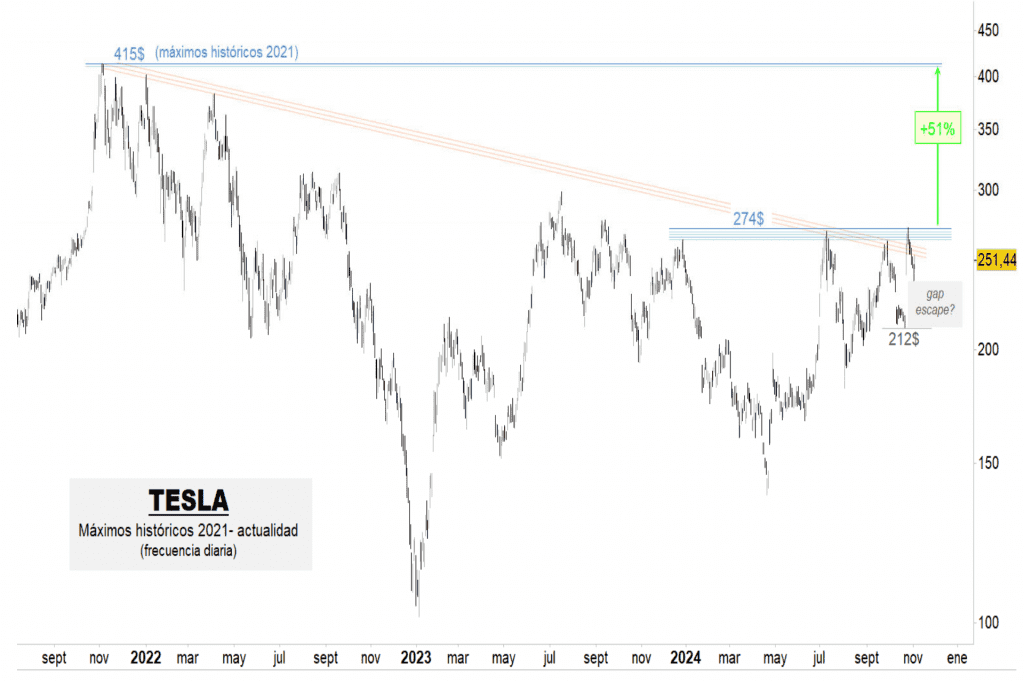 Renta 4 | En los últimos dos meses hemos venido incidiendo en el potencial alcista del valor en el medio plazo: El potencial de TESLA es tremendo. Unas semanas más tarde, el precio comienza a transgredir el paso de la directriz bajista desde los máximos de 2021, si bien manteniéndose todavía debajo de la resistencia formada desde finales de 2023 en 274 dólares, punto clave final para confirmar un cambio de tendencia y una probable vuelta a dichos máximos de 2021, en niveles de 415 dólares, un 51% por encima de esos 274 dólares.