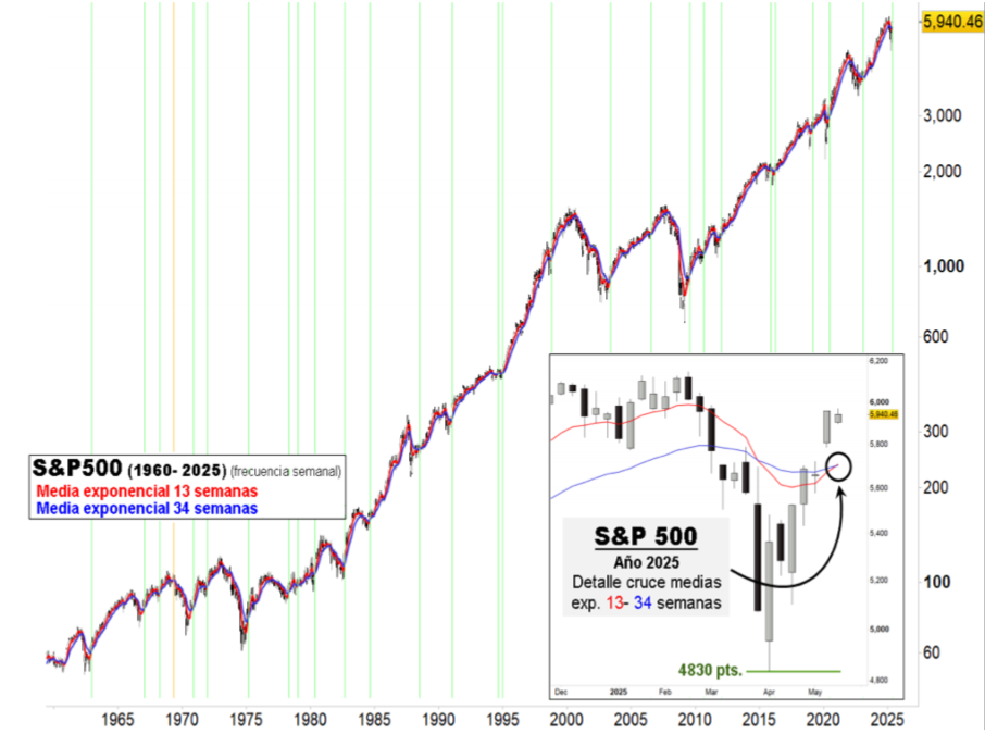 Renta 4 | En octubre de 2023, cuando el S&P 500 experimentaba una corrección hacia 4.100 puntos que parecía abrir una continuidad bajista a las caídas de 2022, expusimos un informe donde analizamos las implicaciones alcistas históricas del cruce de las medias semanales exponenciales de 13 y 34 semanas, concluyendo la probabilidad de que el índice se encaminara y batiera los máximos del año 2022.
