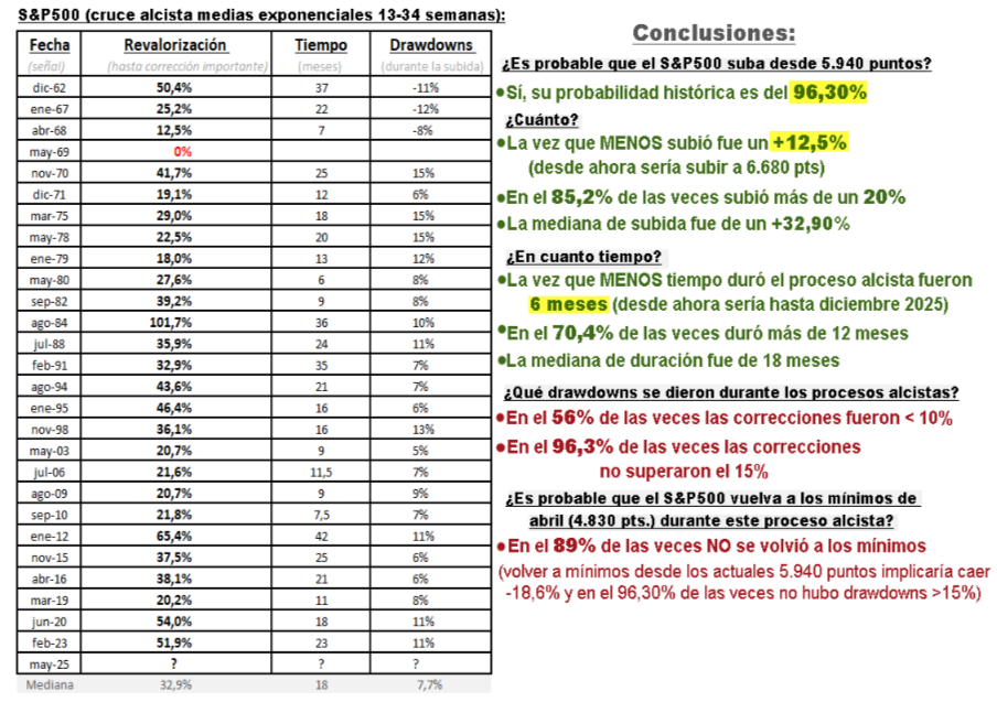 En la tabla inferior se detallan las 27 ocasiones en los últimos 64 años en los que este cruce semanal se ha producido. Se aprecia cómo sólo ha habido una ocasión (mayo 1969) en la que esta señal ha fallado. En otras dos ocasiones, tras la señal alcista, se volvió a los mínimos previos (4.830 puntos del 7 de abril), pero se terminaron desarrollando sendos procesos alcistas en los siguientes meses: