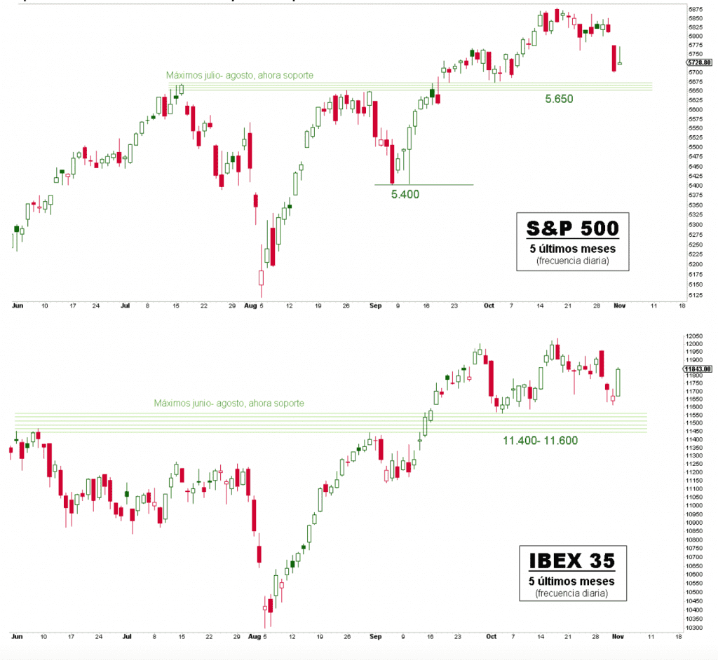 Renta 4 | Los principales índices se mantienen con livianas correcciones en las últimas semanas, con el S&P 500 por encima de los 5650 puntos, máximos de julio y agosto, que preceden a los mínimos de septiembre en 5400 puntos. Del mismo modo, el Ibex 35, más poderoso que sus homólogos, se mantiene por encima de aquellos mismos máximos de junio-agosto, que le marcan un soporte inmediato entre 11400 y 11600 puntos: