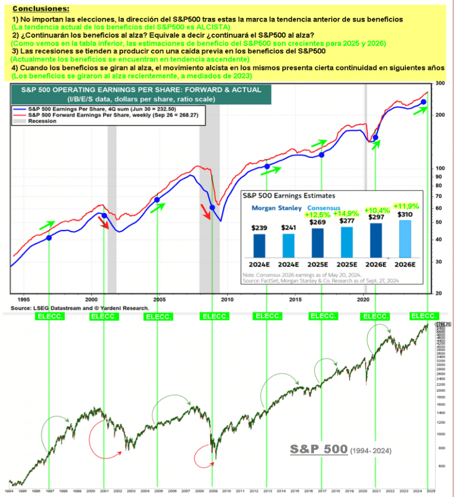 En el gráfico de abajo, expuesto hace unas semanas, se puede apreciar de forma clara que lo que marca el desarrollo del S&P500 en el medio plazo es el beneficio de sus compañías. Además, nótese que, hasta la fecha, en las últimas ocasiones electorales, la tendencia que el beneficio traía hasta esa fecha prevalecía varios meses más tarde tras las elecciones. Podemos ver cómo la tendencia actual de los beneficios es creciente, tras haberse girado al alza en 2023. En base a los datos históricos, y a las estimaciones de los analistas de cara a 2025, la tendencia del S&P500 podría mantenerse al alza, con sus correcciones, en los próximos meses.
