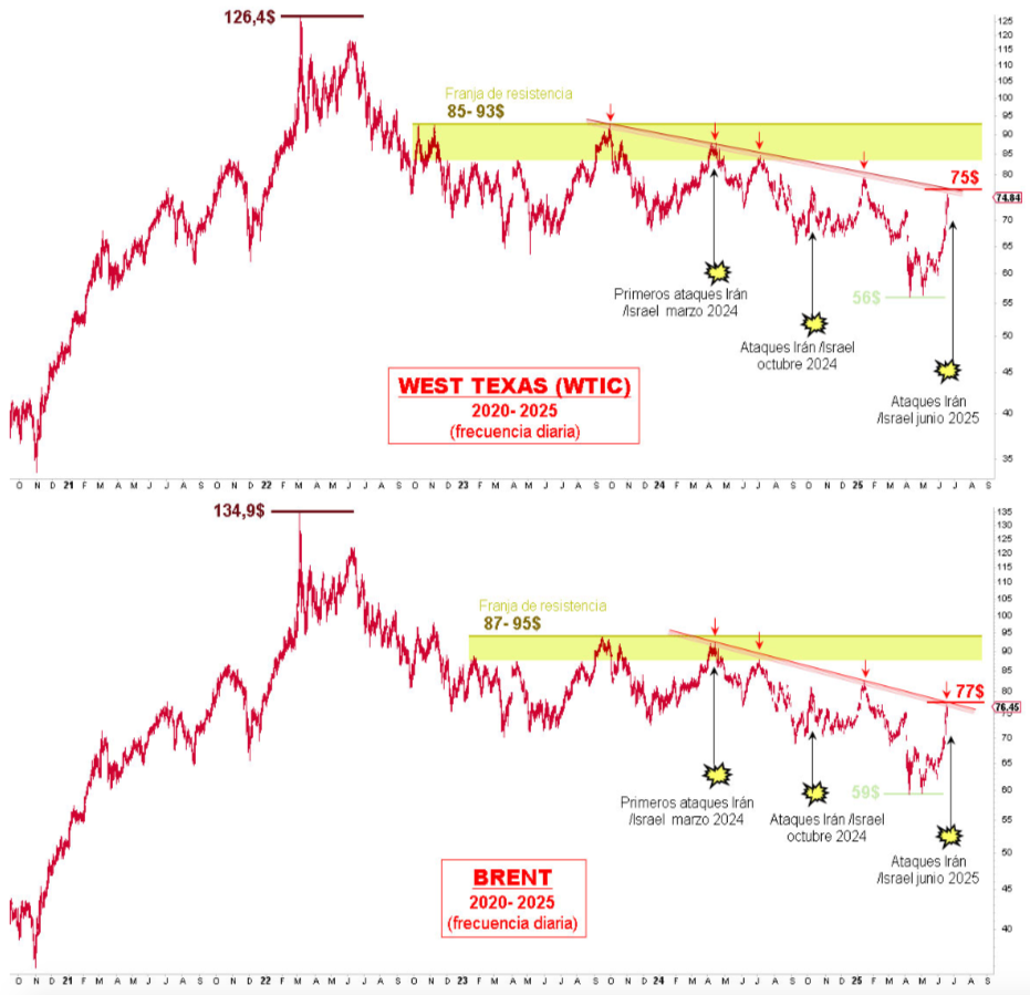 Renta 4 | Los terceros enfrentamientos de los últimos dos años entre Israel e Irán han provocado un nuevo repunte del precio del petróleo, aunque, como podemos apreciar en ambas referencias (West Texas y Brent), la tendencia imperante se mantiene lateral desde finales de 2022.