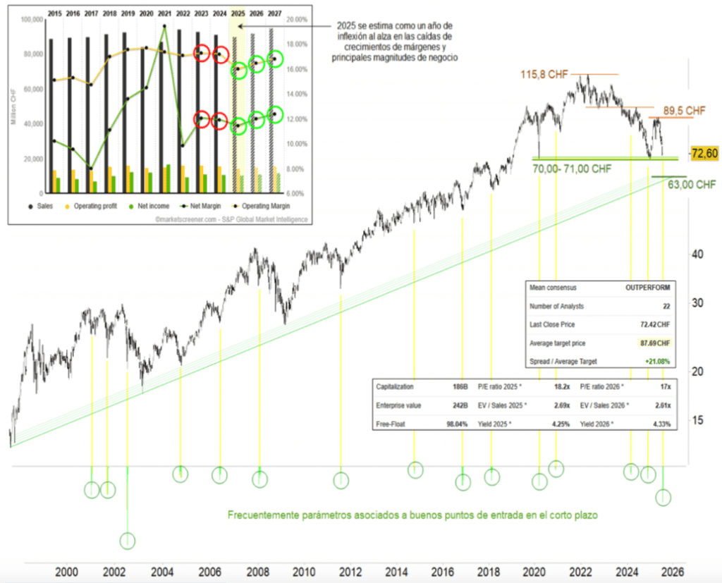 Renta 4 | El valor retorna a los mínimos del pasado mes de diciembre, también mínimos de 2020, que configura una importante zona de soporte en el corto plazo entre 70 y 71 francos suizos. Los parámetros en los indicadores técnicos frecuentemente han venido asociados a zonas atractivas de compra a pocos meses vista. De cara al medio plazo la zona de soporte actual y el paso de la directriz alcista en 63 francos se alzan como un área clave a respetar.
