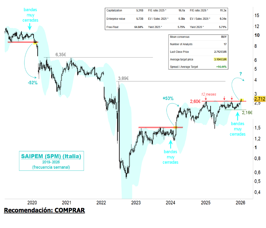 Renta 4 | Saipem bate esta semana su resistencia durante 12 meses: la zona de 2,60 €. La italiana de servicios petroleros rompe esta semana la zona de 2,60 euros, resistencia desde enero del año pasado. La ruptura se produce en una situación técnica especial, con sus bandas de fluctuación anómalamente cerradas, siendo frecuentemente la antesala de movimientos de mayor intensidad en el sentido de la ruptura. La zona de mínimos de los últimos meses, en 2,16 euros, representa su principal soporte ante una toma de posiciones. Primera resistencia importante en niveles de 3,89 euros.