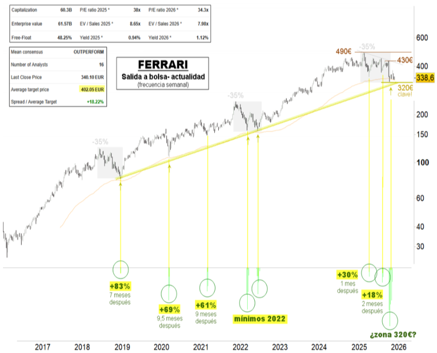Renta 4 | Paso de directriz alcista y media móvil adaptada a las peores correcciones de la tendencia alcista desde su salida a bolsa confluyen en la zona de 320 euros, donde el precio se ha estabilizado durante las últimas semanas. Se presenta un nivel táctico clave para la continuidad o pérdida de la tendencia alcista principal. Los indicadores técnicos semanales muestran lecturas asociadas a la cercanía de zonas de rebote de cierta importancia. Resistencias en 430 euros y en los máximos históricos de febrero en 490 euros.