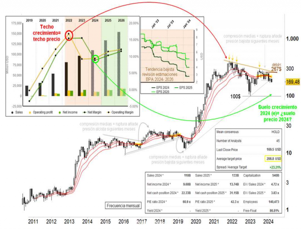 Pese a la posibilidad de rebotes, estos no cambiarán el mal momentum técnico por debajo de 267 dólares, paso de la directriz bajista desde los máximos históricos de 2021. Las revisiones de los BPA 2024-2026 mantienen una tendencia a la baja y las estimaciones de crecimiento de sus principales magnitudes plantean una caída hasta este año, donde se produciría un punto de inflexión, lo que frecuentemente se correlaciona con las tendencias en los precios.