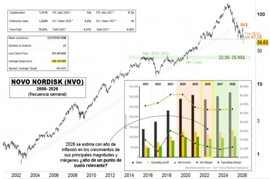 Esta semana, tras los resultados decepcionantes del ensayo Redefine 4 con CagriSema (su fármaco experimental de próxima generación contra la obesidad), el precio ha perforado con claridad la zona de soporte y ha dejado un hueco bajista significativo en torno a los 47,50 dólares, nivel que ahora actúa como resistencia ante cualquier intento de rebote. Actualmente, el precio carece de soportes aparentes hasta la franja histórica de máximos entre 2015 y 2019 (coincidente con los mínimos post-COVID), situada aproximadamente entre 22,35 y 25,65 dólares. Las estimaciones de los analistas apuntan a que durante este año se produciría una inflexión en los crecimientos de sus principales cifras y márgenes, tras dos años de contracción.