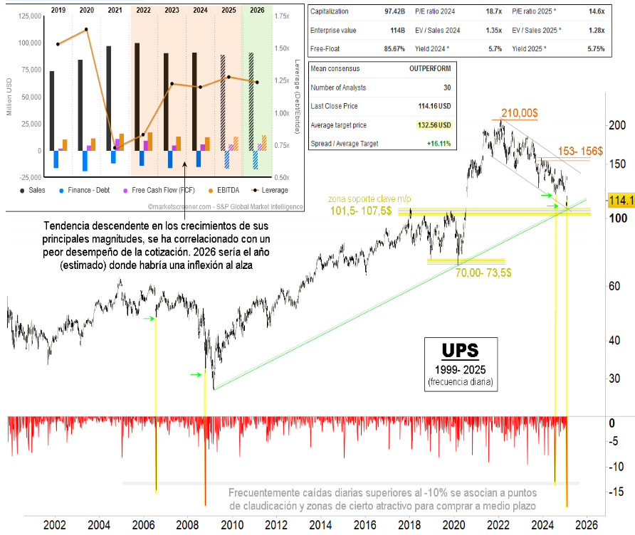 Centrándonos en la evolución del precio, en el gráfico inferior se aprecia la tendencia descendente en los crecimientos de sus principales magnitudes desde el año 2022, lo que ha venido de la mano de una tendencia correctiva en la cotización, que la semana pasada alcanzaba el -47,7%. La caída desde los máximos históricos registrados en 210 dólares en 2022 viene canalizándose a la baja, alcanzando entre 101,5 y 107,5 dólares la zona de máximos de 2018 y 2019, nivel que también coindice con el paso de la directriz alcista desde 2009. La caída del 14% del pasado 30 de enero es la mayor registrada en un solo día, lo que históricamente ha venido asociándose a claudicaciones inversoras y zonas de cierto atractivo comprador. Pese a que es posible que la volatilidad continúe durante 2025 hasta que se digiera la incertidumbre del impacto en los futuros resultados de Amazon, tomaríamos posiciones oportunistas, en base a los últimos excesos en las caídas, aunque con la condición del respeto de la zona de soporte entre 101,5 y 107,5 dólares.