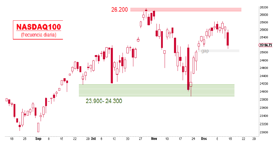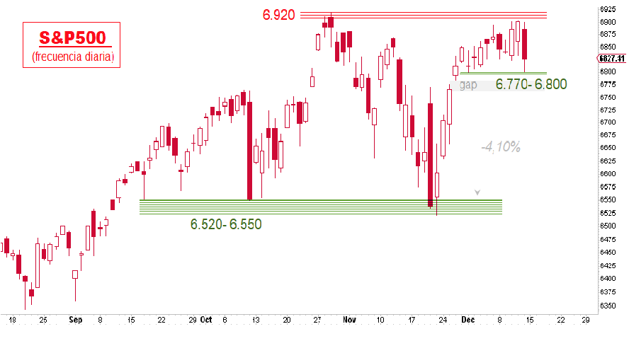 Los mínimos del pasado viernes en el S&P500, en la zona de 6.770- 6.800 puntos, se considerarían un primer nivel de soporte de corto plazo (mínimos de las últimas diez sesiones), precediendo al más importante de plazo en los mínimos de finales de noviembre, entre 6.520 – 6.550 puntos.