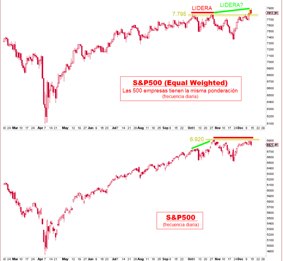 un 30% en el índice, por lo que el movimiento de éste se ve profundamente impactado por lo que aquellas hacen. El índice S&P500 Equal Weighted (ponderado por igual) corrige esta distorsión, considerando cada una de las quinientas empresas igual de relevantes a efectos de su influencia en la evolución del índice. Como podemos ver en el gráfico inferior, este índice de igual ponderación marcaba la semana pasada máximos históricos por encima de los registrados a primeros de octubre, mientras que el S&P500 aún se mantiene por debajo de los máximos de finales de ese mes, lo que sería un aviso positivo para el principal selectivo americano.