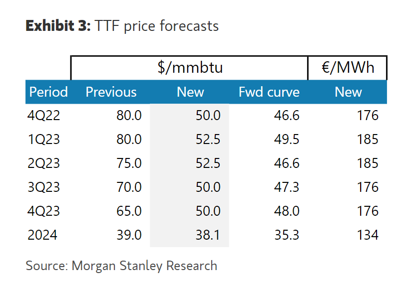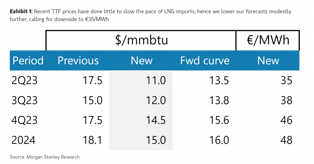 Morgan Stanley | Demanda floja e importaciones altas de LNG siguen ayudando a tener altos niveles de inventarios y presiona los precios futuros a la baja. Nuestro analista Martijn señala que necesitaría ver precios de €35/MWh para potenciar la demanda y frenar importaciones. Sigue negativo en precio del gas. Esta es la tabla de estimaciones: