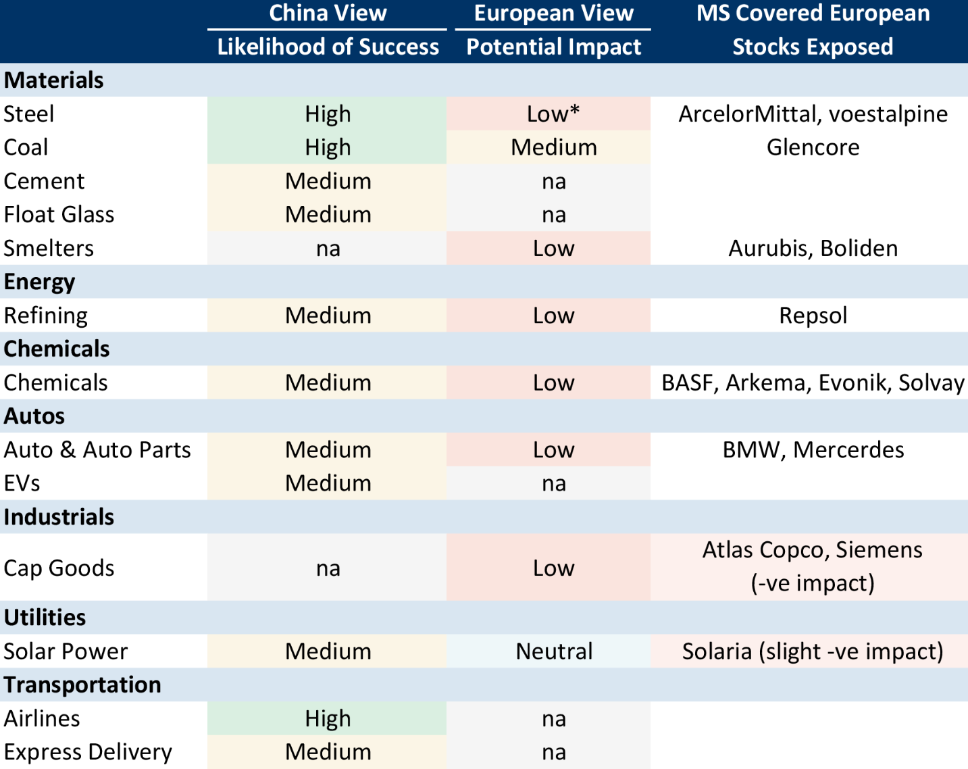 Morgan Stanley | Matt Nguyen (analista) examina los impactos de la iniciativa anti-involution de China sobre el Equity EU, en colaboración con analistas de renta variable y estrategia china. Dado el carácter doméstico de las reformas, anticipa beneficios en Europa a más largo plazo, con mineras de carbón y acero como las más favorecidas, seguidas por refinerías, químicos y automóviles. Identifica 12 beneficiarios potenciales a largo plazo en Europa: Glencore, ArcelorMittal, Voestalpine, Aurubis, Boliden, Repsol, Arkema, BASF, Evonik, Solvay, BMW y Mercedes-Benz. Añade que Atlas Copco, Siemens y Solaria podrían verse perjudicadas a largo plazo.