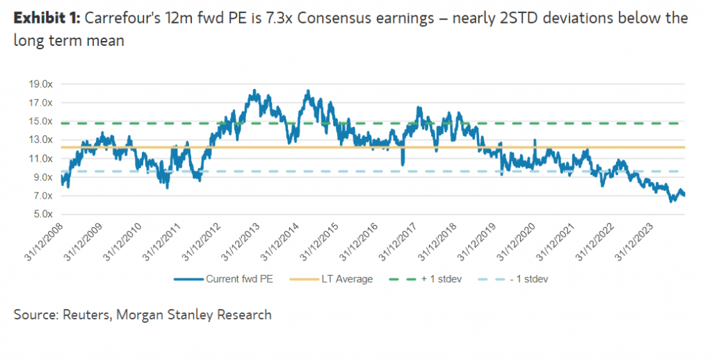 2.- Carrefour también ha dicho estar interesado en vender una participación o la totalidad de la compañía si aparece un comprador adecuado. Oportunidades de M&A se han estudiado en varias ocasiones en el pasado. Carrefour ahora cotiza a 7.3x PE, con un 40% de descuento sobre su media de largo plazo.