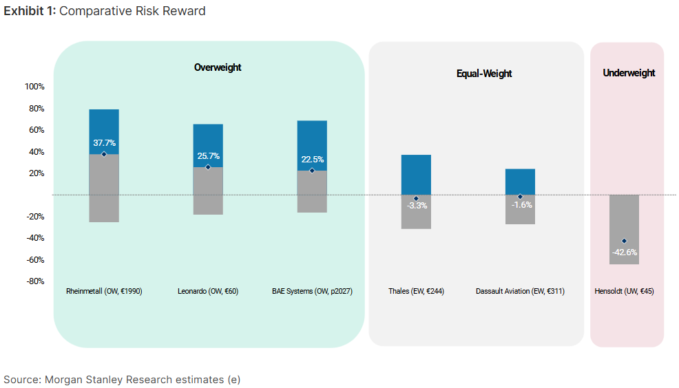 Morgan Stanley | Ross Law (analista) reconoce el re-rating que ha tenido el sector (a 20x P/E 2027 FY3, por encima de la media pre-invasión a largo plazo de 12x) sobre la base de unas expectativas de aumento del gasto en Defensa. Sin embargo, señala que ese re-rating simplemente ha situado la valoración en niveles más razonables para el outlook de crecimiento en earnings (que aún sigue basado en el 2% del PIB). Y dado el potencial de aumento del gasto en Defensa y el ciclo de revisiones al alza (que aún no ha empezado), Ross cree que hay más potencial de re-rating. Y a esto se suma un set up de posicionamiento favorable, especialmente a medida que se moderan las restricciones ESG. Con todo esto, Ross actualiza sus modelos y valoraciones, y sube el precio objetivo de sus compañías bajo cobertura (un 45% de media).