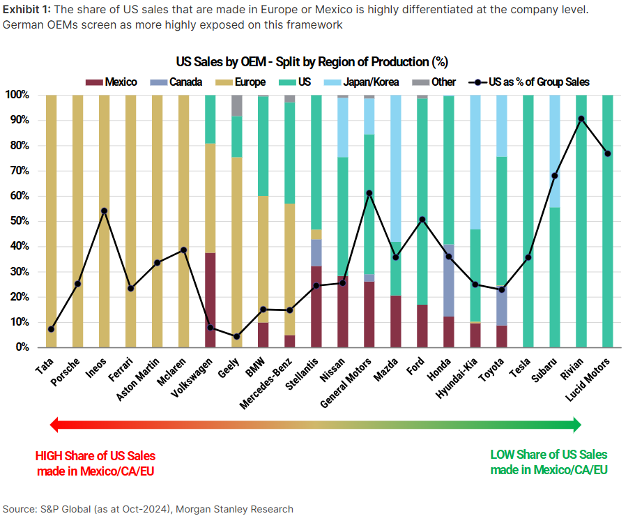 Morgan Stanley | El acuerdo alcanzado entre la UE y EEUU reduce los aranceles aplicables al sector al 15% (vs 27.5%). Y aunque Javier Martínez de Olcoz (analista) lo ve como un paso en la dirección correcta, sigue viendo margen para alcanzar un arancel del 10% (escenario base). Y además, cree que los debates también se centrarán a nivel compañía también. Y en este sentido, destaca que los OEMs Premium alemanes (Porsche, BMW y Mercedes) son los más expuestos, y por tanto deberían ser los más favorecidos en caso de una reducción adicional del arancel aplicable al sector.