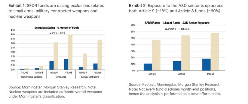 Morgan Stanley | Arushi Agarwal (analista) estima 38–71 billones de dólares de posibles compras de acciones globales de A&D desde fondos de sostenibilidad en Europa, incluso manteniendo restricciones sobre armas polémicas. Para la cobertura europea de A&D, este gap es de 23–43 billones de dólares, equivalente al 3–5% de la capitalización de mercado o 11–21 días de volumen. Esto asume que las exposiciones aumentarán en línea con el MSCI ACWI o MSCI Europe, dependiendo del enfoque de inversión, manteniendo las restricciones sobre armas polémicas.