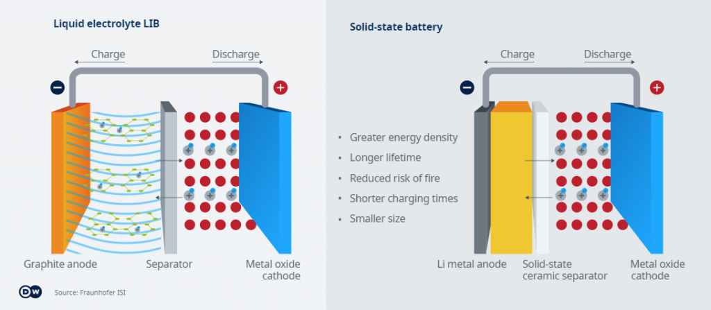 Una batería de estado sólido sustituye el electrolito líquido de una batería de iones de litio por un electrolito sólido. La batería resultante puede alcanzar una densidad energética mucho mayor y mejora la seguridad al reducir el riesgo de explosión o incendio. Gracias a su mayor densidad energética y menor necesidad de componentes de seguridad, la batería puede reducirse mucho de tamaño, lo que la hace ideal para el transporte por carretera.