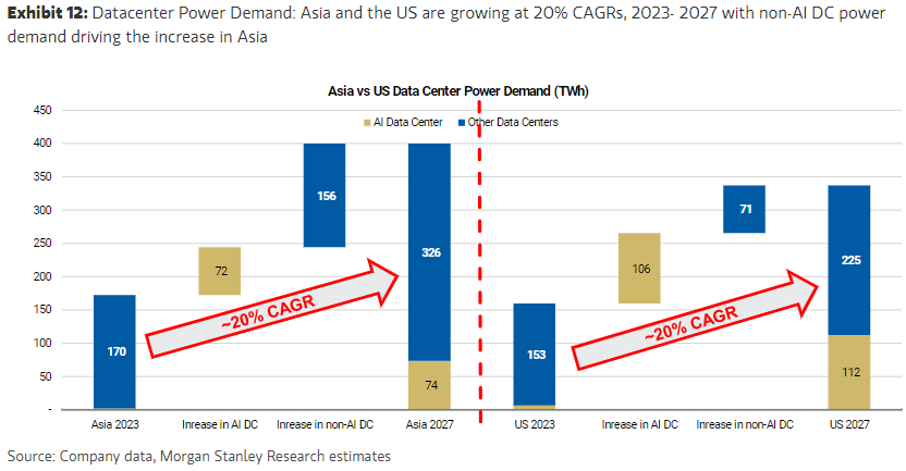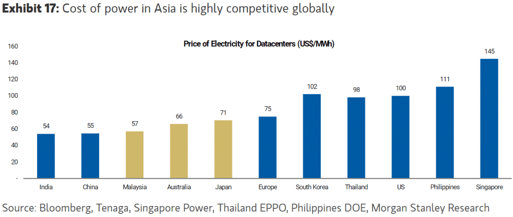 Morgan Stanley | Con un potencial de 100 Bn$ en inversiones, Malasia, Japón y Singapur son las principales beneficiarias de la inversión por parte de empresas como AWS, Microsoft, GDS, así como otros hyperscalers regionales/globales. En concreto, los analistas del equipo de energía de Asia esperan que la demanda de los centros de datos asiáticos se duplique hacia 2027 impulsada por: