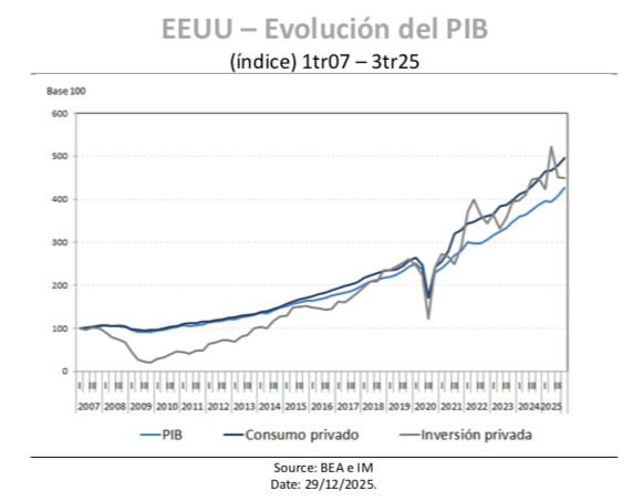 El aspecto más flojo estaba en la formación de capital y su -0,3% trim. a. con una desaceleración generalizada en todas las partidas. La inversión empresarial daba un paso atrás y aunque crecía un +2,8% trim. a. quedaba lejos del +7,3% anterior, en parte porque se producía una moderación clara en todas las subpartidas, desde inversión en bienes de equipo (+5,4% trim. a.) a la de propiedad intelectual (+5,4% trim. a.). Aun así, se mantenía sólida por la inversión en ordenadores, equipos y la inversión en centros de datos. La mayoría de los factores clave para un nuevo impulso de la inversión parecen estar presentes para 2026, así que, dentro de unas cifras más normalizadas, deberían de seguir la expansión.