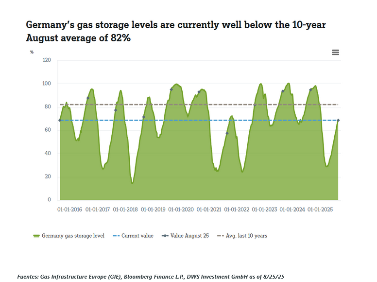 DWS | A solo unas semanas del inicio de la temporada de calefacción, los niveles de almacenamiento de gas en Alemania están llamando la atención. A finales de agosto, las reservas se situaban en el 69% de su capacidad, muy por debajo de la media estacional de los últimos diez años, que ronda el 82%, y marcan el nivel más bajo para esta época del año desde 2015, aparte del año de crisis de 2021. Los países vecinos se encuentran en una posición más sólida: Francia y Polonia se acercan al 80%, Austria al77 % y Bélgica lidera con un 90%[1]. ¿A qué se debe este déficit y qué significa para la economía?