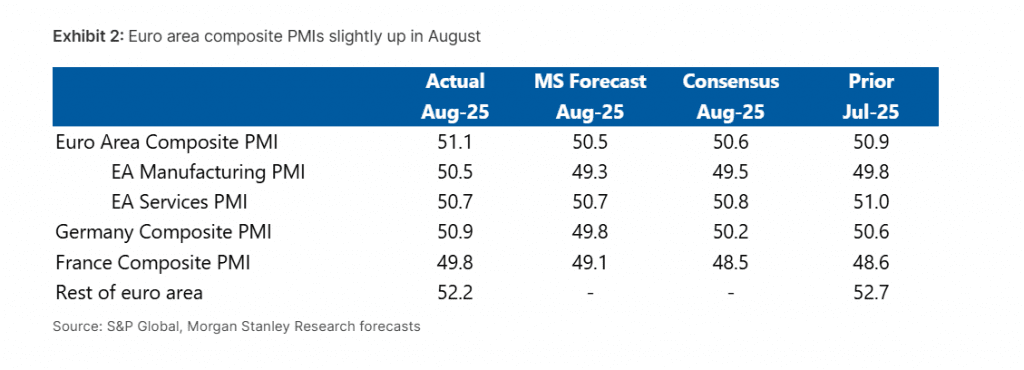 Morgan Stanley | El PMI composite subió hasta los 51.1 puntos en Agosto, desde el 50.9 de Julio, y por encima de las expectativas de 50.6. Los subíndices de Manufactura y Servicios quedaron en 50.5 y 50.7 puntos, vs las previsiones del consenso de 49.5 y 50.8 respectivamente. Jens Eisenschmidt (Macro EU) comenta que, aunque estos datos no son elevados desde un punto de vista histórico, no muestran ningún signo del deterioro macro que estaba esperando, y revisa su previsión para el BCE: ahora PREVÉ SÓLO UNA BAJADA DE 25PBS EN DICIEMBRE, SEGUIDA POR OTRA EN MARZO, hasta el mismo tipo terminal que antes del 1.50%, pero que llegará más tarde de lo que pensaba anteriormente.