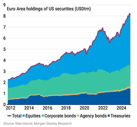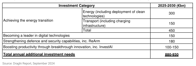 Resumiendo y simplificando, el plan es una respuesta a la necesidad de la EU (según Mario Draghi) de invertir USD 900bn al año (5% del PIB) … para cerrar el gap de competitividad con USA en materias como la Transición Energética, Tecnología, desarrollo de la IA … o Defensa. La cuestión es que aunque los estados miembros están al límite de su capacidad fiscal … los hogares tienen una tasa de ahorro del 15% … 4x la de USA … e inversiones de unos EUR 33tn en activos que de bajo ROI (EUR 10tn en depósitos). Además, los inversores Europeos invierten anualmente EUR 300bn en activos USA.