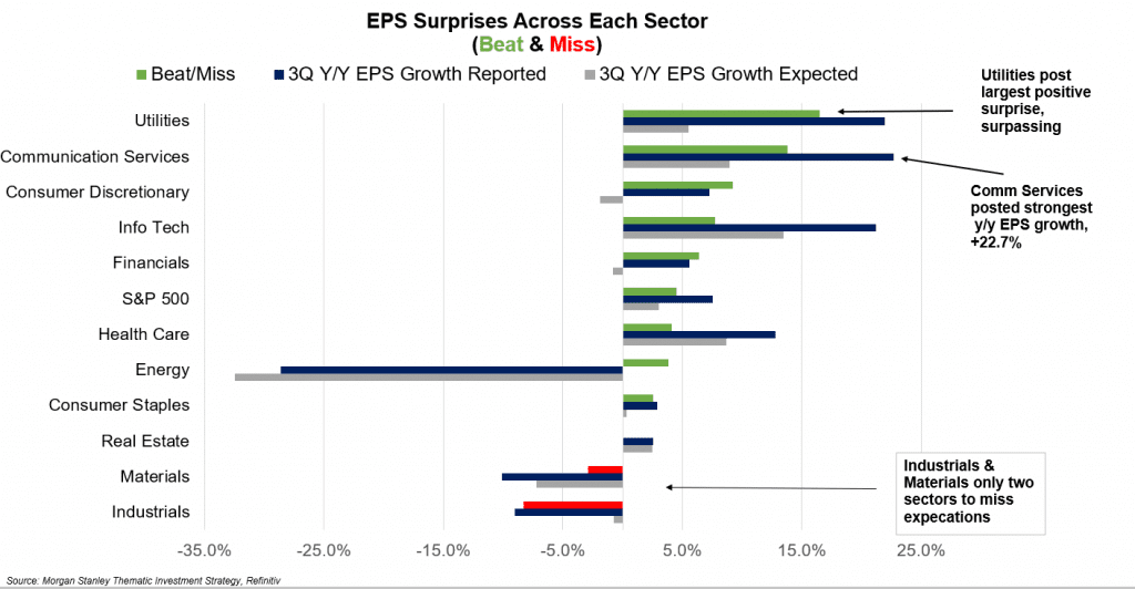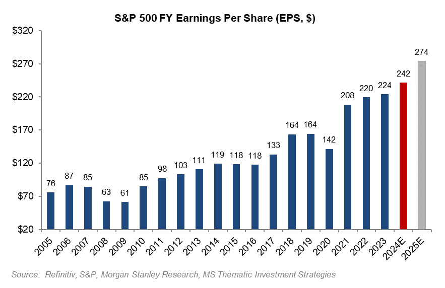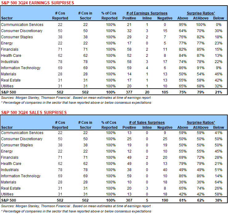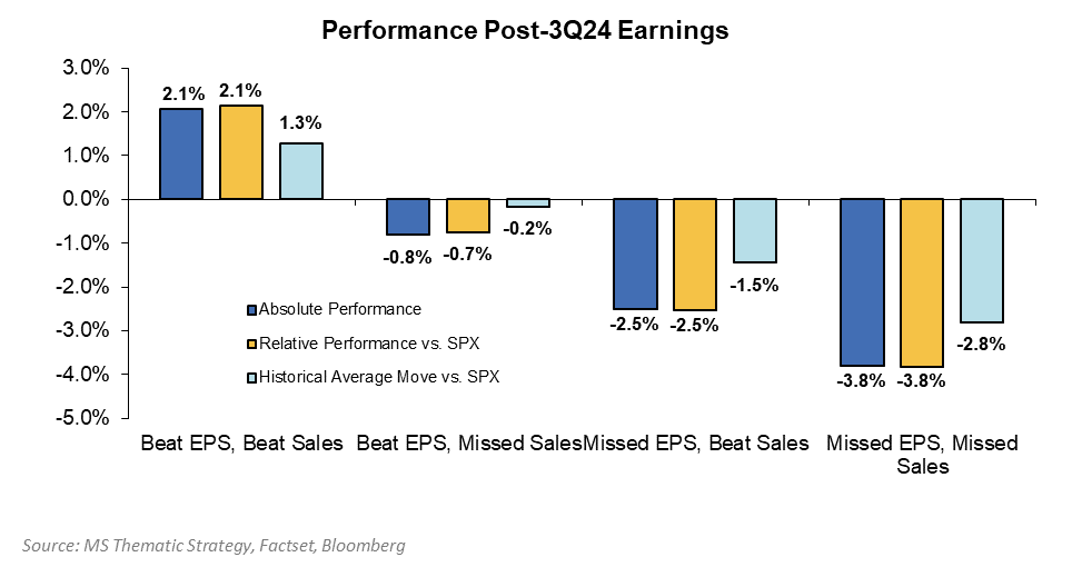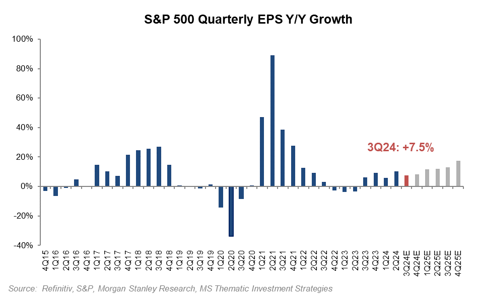 Morgan Stanley | Resultados en Estados Unidos: el S&P cierra el año con el cuarto trimestre consecutivo de expectativas por encima de lo esperado. Un 75% de las compañías han batido estimaciones de beneficios y el BPA del 3Q24 ha crecido un 7.5% Y/Y, más del doble de las estimaciones de 3%.