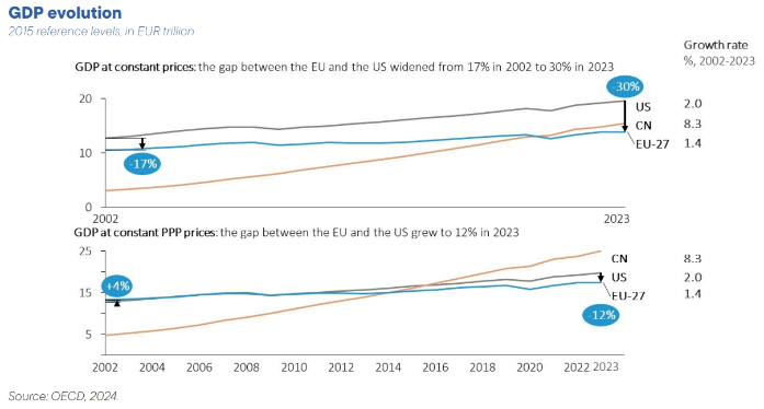 Las inversiones europeas deben reorientarse hacia el crecimiento de la productividad y las tecnologías innovadoras… ahora el tiempo apremia , tras los numerosos llamamientos realizados en 2024 sobre la necesidad de cerrar una brecha de 20 años entre el PIB de EEUU y el de la UE (+23p.p. desde 2002 —véase el gráfico arriba— debilitamiento del crecimiento de la productividad, menor crecimiento de los ingresos, menor demanda interna…) según los informes publicados por Draghi, Letta y la Dirección General de Competencia (libro blanco titulado «¿Cómo dominar las necesidades de infraestructura digital de Europa?») o el reciente libro verde sobre estrategia industrial del gobierno británico.