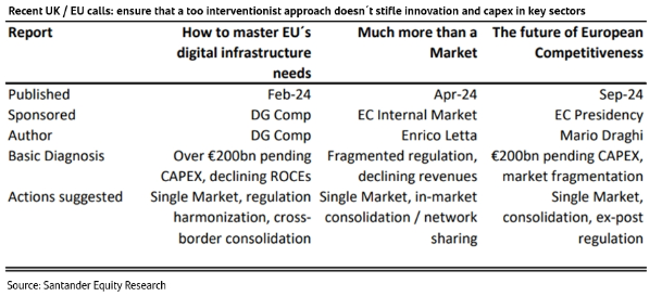 El papel de la actividad corporativa en este debate. Es necesario aumentar la competitividad de la UE para reactivar la productividad y sostener el crecimiento. Como resume nuestro responsable de TMT en renta variable, el llamamiento de Mario Draghi es claro: «Facilitar la concentración del sector de telecomunicaciones en Europa para mejorar la innovación y la inversión, siempre y cuando no afecte de forma notable al bienestar del consumidor (lo que entendemos por precios). En nuestra opinión, prioriza el impacto positivo sobre las inversiones con una visión menos dogmática sobre los precios, por delante de posibles operaciones de actividad corporativa. Suponemos que esto incluye la consolidación dentro del mercado, puesto que el informe pide que los mercados se midan a escala de la UE, para reducir la restricción de los umbrales de cuota de mercado local».