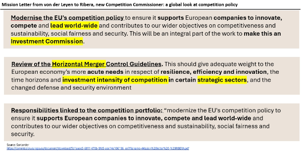 El nuevo papel de la Comisaria de Competencia de la UE. La “Carta de Mandato” que Ursula von der Leyen envió a Teresa Ribera, la nueva Comisaria de Competencia, ofrece unas pistas muy claras: (1) una mirada global a la política de competencia; (2) las empresas necesitan innovar, competir y liderar a nivel mundial; y (3) la necesidad de revisar las directrices de control de las fusiones horizontales.