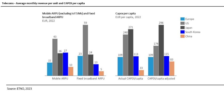 Precios bajos y fragmentación, la raíz de los problemas de las TMT. ¿Por qué las TMT son ahora el centro de atención? El informe de Draghi sobre el sector de las telecos en la UE se centra en dos temas principales, según indica en su informe nuestro compañero de renta variable Fernando Cordero: La necesidad de las compañías de telecomunicaciones europeas de efectuar inversiones (según se deriva de los dos informes ya mencionados) asciende a cerca EUR 200mm. Los reducidos ingresos medios por usuario conllevan bajas inversiones.El mercado europeo de las telecomunicaciones está muy fragmentado: hay 34 ORM en Europa, frente a un puñado de ellos en EE.UU. o China, en parte debido a los obstáculos a la consolidación.