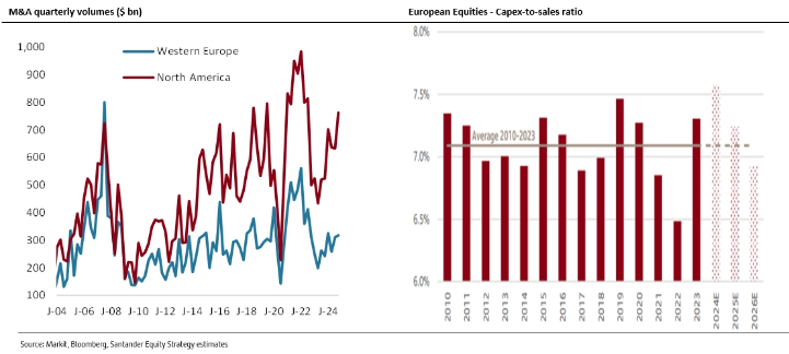 En síntesis, vemos probable que la actividad corporativa, la inversión y la emisión se recuperen a partir de 2025 y tal vez den un vuelco a una tendencia a la baja prevista por nuestros estrategas de renta variable (véanse las previsiones de capex más abajo). La brecha entre la actividad corporativa en USD y EUR también podría empezar a cerrarse.