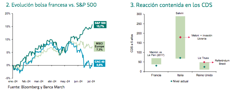 En el mercado de renta fija, el estrés ha sido bastante contenido. La prima de riesgo francesa, a pesar de situarse 10 p.b. por encima de la portuguesa, se mantiene en niveles similares a los que cotizó en las legislativas francesas de 2017. En el caso de los seguros de impago que se utilizan para asegurar la deuda (CDS a 5 años), los niveles son menos agresivos: cotiza a 35 p.b., justo la mitad que entonces. Tal y como muestra el gráfico, con el tiempo, las aguas suelen volver a su cauce, por más que esta vez los ánimos no se hayan estresado demasiado.