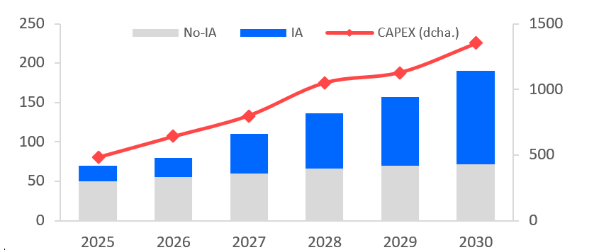 La capacidad de los centros de datos se mide por su consumo de energía -históricamente en MW, pero ahora ya en GW-. Las estimaciones actuales parten de los proyectos ya anunciados. Como los centros de datos tienen un periodo de construcción y puesta en marcha que puede alargarse hasta 5 años, la capacidad instalada para 2030 debería ser fácil de proyectar. Los proyectos actualmente previstos, y que se espera que se terminen produciendo, sitúan la capacidad instalada en 2030 cerca de los 200GW, representando la IA cerca de ~130GW y prácticamente la totalidad de la inversión en centros de datos en los próximos años. En términos de crecimiento, esto supone un incremento de 42% CAGR 25-30. Como es probable que el crecimiento continue más allá de 2030, la inversión estimada para el periodo es superior, ya que cubre parte de los desarrollos que llegaran en forma de capacidad de computación posteriormente a 2030.